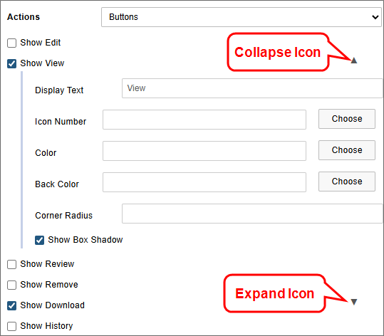 Actions: These controls enable you to control form actions, like placing buttons, or choosing objects via a picker,