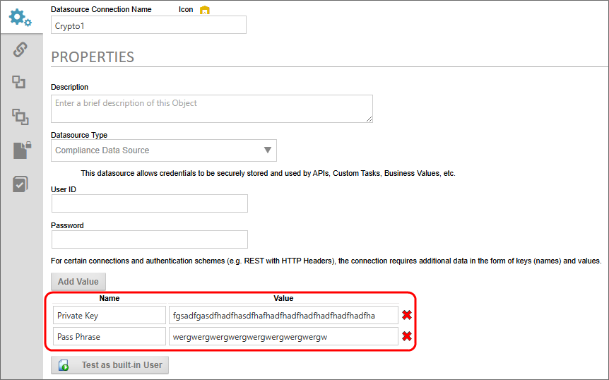 The Compliance Datasource will need to have the appropriate values added to store the Private Key and Pass Phrase for the encryption, e.g.:
