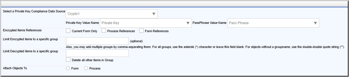 Enables you to select the Compliance Datasource object that contains the correct Private Key and Pass Phrase to decrypt the document. Once selected, the two properties below will appear on the page. |