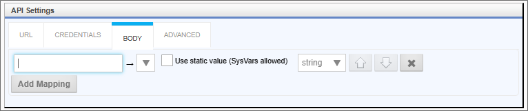 | This tab enables mapping for form fields or system values to the API call. Initially this tab will display only the Add Mapping button, which will add a new field mapping row each time it is clicked. Each field mapping row will display the following properties: | ||