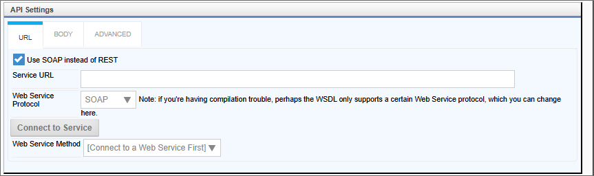 | Use SOAP instead of REST | This property, when checked, indicates the API call will be made to a SOAP web service. When checked, the Credentials tab will be hidden. Checking this field will alter the property values that appear in this tab, to reflect the appropriate REST or SOAP properties. | |
