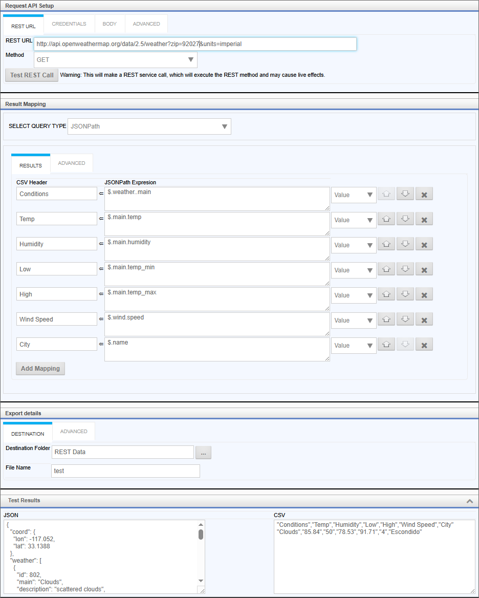 After configuring the Rest URL and Method properties, you can click the Test REST Call button. This button will invoke the REST CALL, and fill in the JSON/XML, and CSV results fields in the Test Results section at the bottom of the configuration screen. The CSV property will be blank until you provide the column mapping and XPath/JSONPath expressions in the Result Mapping section to map the REST data to the CSV file's columns.