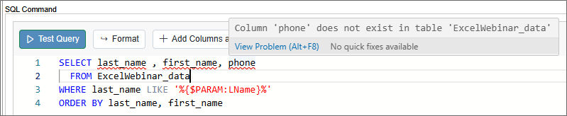 In addition, since the Monaco editor knows what tables and fields are available, error checking is automatically applied. For example, if you enter the incorrect table name, the automatic error checking will display errors in your SQL statement, with error messages that appear whenever you mouse over the error markers.
