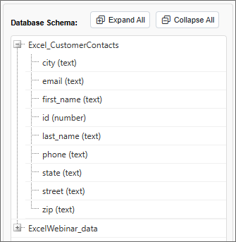 In the right pane, Expand All and Collapse All buttons enable you to show or hide all of the elements in the table treeview.