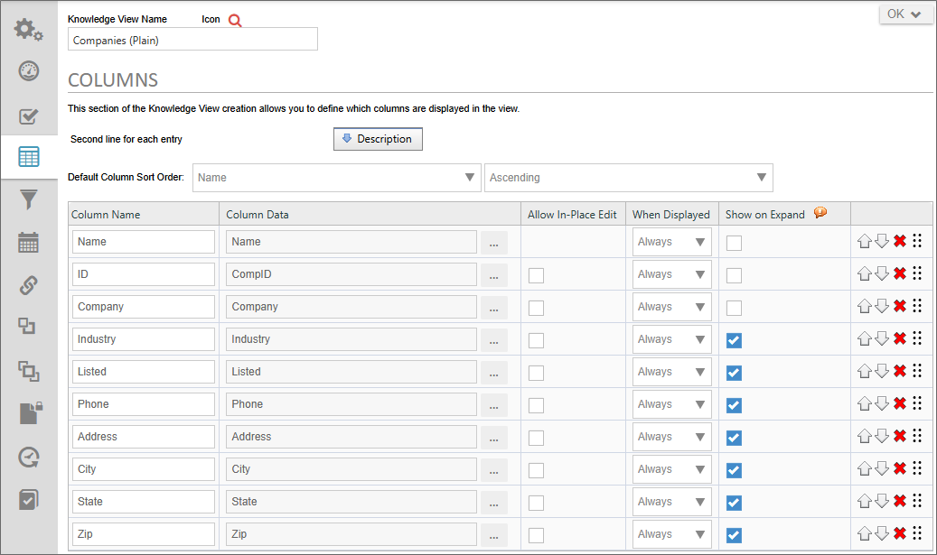 The Columns tab defines the columns to display in the Knowledge View. The column data can include form fields, process data, Meta Data, or various object properties. The order of the columns can be changed using the up arrow