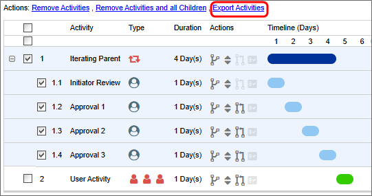 When one or more Process Timeline activities are selected in the Timeline definition, an action link labeled Export Activities will appear.