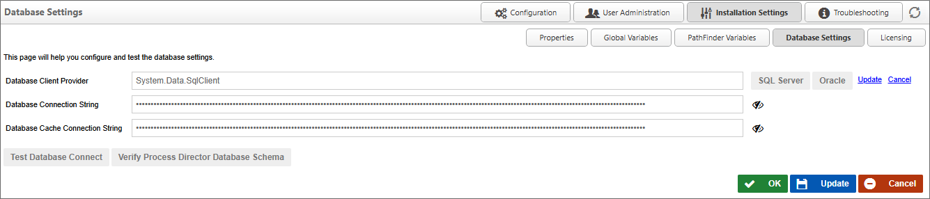 The Database Settings page allows you to set the database connection string and database client provider. Once you have entered your connection strings, ensure that you saved your settings. You may also test the connection by clicking the Test Database Connect button. This will return a valid statement or return an error. The Verify Process Director Database Schema button will run a test on the database to ensure that the data schema for the Process Director database you've selected is compatible with the version of Process Director you have installed.