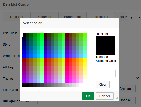 The Font Color and Background Color properties enable you to specify the color used to display text or background colors, respectively. Using the Theme property to select a theme will override any settings you specify for these properties. You can specify the color in two ways:
